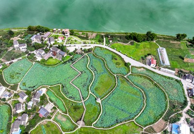 圖為2025年6月24日,鳥瞰四川省華鎣市利用明月鎮白鶴咀村的渠江灘涂興建的“荷月江岸”生態荷塘景點。(邱海鷹/文圖)