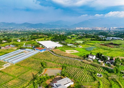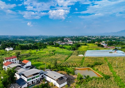 盛夏時節,四川省華鎣市永興鎮馬架坪村連片泛著金黃的玉米、綠油油相繼抽穗的水稻和用于種植養殖業的白色大棚及星羅棋布的民居,在藍天白云映襯下色彩斑斕,如披錦繡,把鄉村點綴得格外和美。