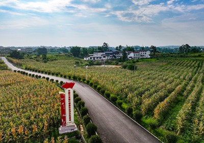 2025年7月21日,四川省華鎣市永興鎮馬架坪村連片泛著金黃的玉米和寬闊的鄉村公路及民居,在藍天白云映襯下色彩斑斕,如披錦繡。