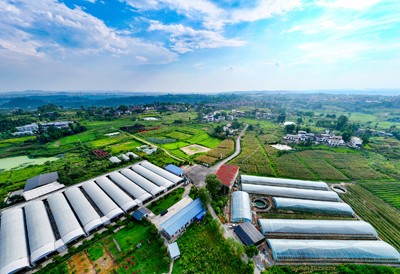 2025年7月21日,四川省華鎣市永興鎮馬架坪村連片用于種植養殖業的白色大棚和泛著金黃的玉米、綠油油的水稻及星羅棋布的民居,在藍天白云映襯下色彩斑斕,如披錦繡。(邱海鷹/攝影報道)