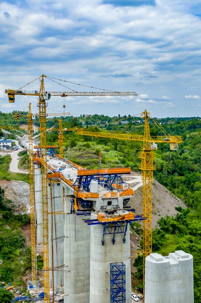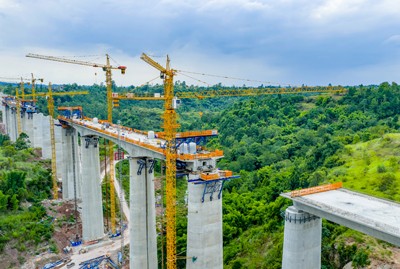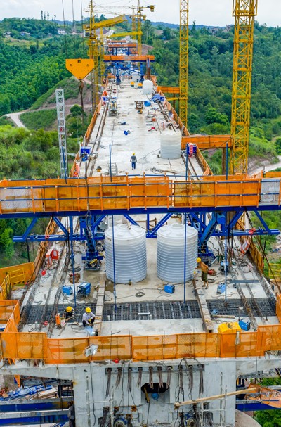 2025年8月23日,中鐵十局的建設者在西渝高鐵四川省廣安華鎣市明月鎮人和寨村林家溝特大橋施工現場,作連續梁順利合龍準備。